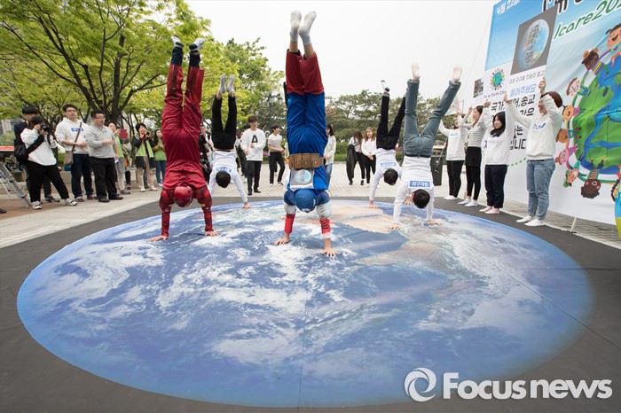 (서울=포커스뉴스) 22일 서울 종로구 광화문시민열린마당에서 지구시민운동연합 회원들이 제46회 지구의 날을 기념해 '나는 지구시민입니다'라는 주제로 플래시몹을 하고 있다.