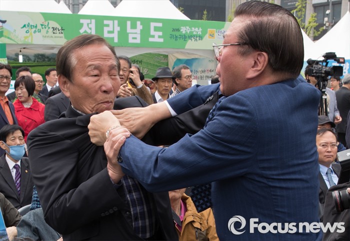 (서울=포커스뉴스) 22일 오전 서울 광화문 광장에서 열린 '2016 광주·전남 귀농귀촌 박람회'에서 오명준(오른쪽) 장흥군향우회장과 한 시민이 몸싸움을 하고 있다.