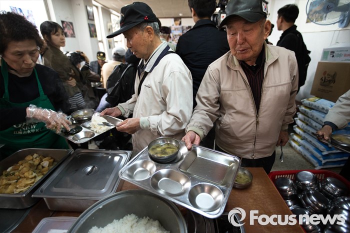 (서울=포커스뉴스) 22일 오전 서울 종로구에 위치한 어버이연합 사무실에서 전경련 자금지원 의혹에 휩싸인 어버이연합의 기자회견이 진행되고 있는 가운데 어버이연합 관계자들이 점심 배식을 받고 있다.