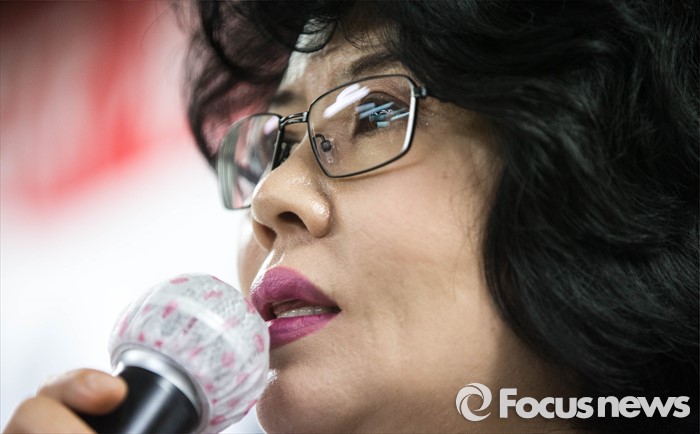 (서울=포커스뉴스) 김미화 자유민연합 대표가 22일 오전 서울 종로구에 위치한 어버이연합 사무실에서 기자회견을 하고 있다. 전경련에서 자금지원을 받은 의혹으로 논란에 휩싸인 어버이연합은 이날 기자회견을 열고 언론에 보도된 어버이연합 관련 기사들에 반박했다.