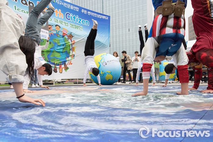(서울=포커스뉴스) 22일 서울 종로구 광화문시민열린마당에서 지구시민운동연합 회원들이 제46회 지구의 날을 기념해 '나는 지구시민입니다'라는 주제로 플래시몹을 하고 있다.