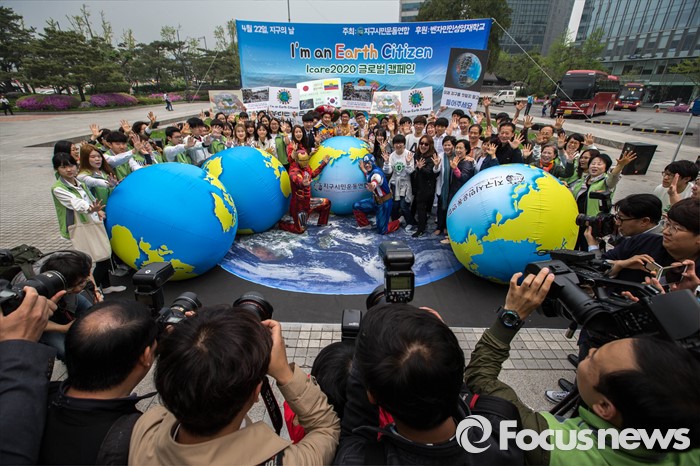 (서울=포커스뉴스) 22일 서울 종로구 광화문시민열린마당에서 지구시민운동연합 회원들이 제46회 지구의 날을 기념해 '나는 지구시민입니다'라는 주제로 플래시몹을 하고 있다.