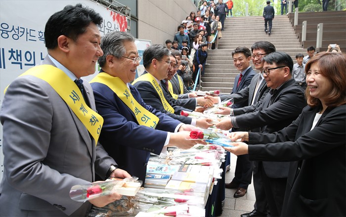 이날 윤태용 문체부 문화콘텐츠산업실장과 박대춘 서점조합연합회장 등 주요 내빈들이 시민들에게 책과 함께 문화융성카드 홍보물 및 장미꽃을 나누어 주고 있다. 이번 행사는 출판산업의 진흥을 기원하고 올해 출시된 문화융성카드를 널리 알려 지역중소서점에 도움을 주기 위해 문체부가 한국서점조합연합회와 교보문고, 비시(BC)카드, 한국출판문화산업진흥원과 함께 마련했다. <사진제공=문화체육관광부>