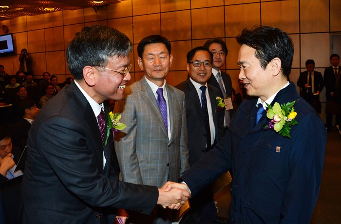 (서울=포커스뉴스) 최상목 기획재정부 차관이 22일 서울 성북구 국민대학교에서 열린 한국벤처창업학회 춘계학술대회에 참석해 남경필 경기도지사와 악수하며 인사를 하고 있다. <사진제공=기획재정부>