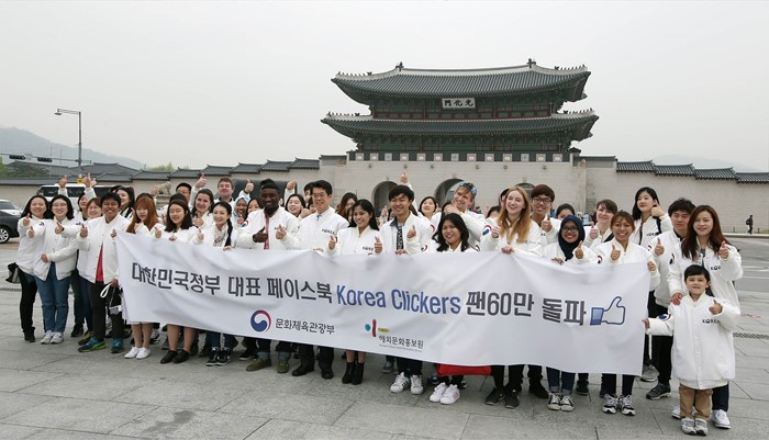 (서울=포커스뉴스) 문화체육관광부 해외문화홍보원이 운영하는 페이스북페이지 ‘코리아클리커스(KoreaClickers)’ 팬들이 22일 광화문광장에서 김갑수해외문화홍보원장과 함께 “한국, 좋아요”를 외치고 있다.