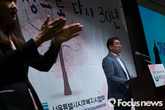 (서울=포커스뉴스) 22일 오후 서울 용산구 백범기념관에서 열린 사회복지사협의회 창립 30주년 기념행사에서 장재구 사회복지사협회 회장이 기념사를 하고 있고 그 옆에서 한 사회복지사가 수화로 설명하고 있다.