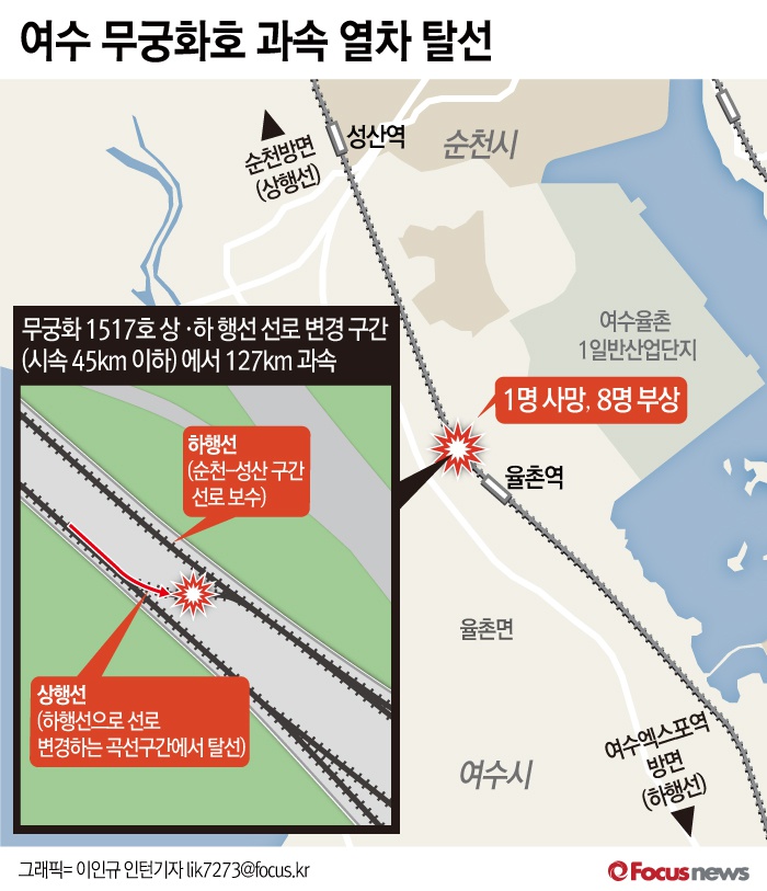 (서울=포커스뉴스) 22일 광주지방철도경찰대는 오전 3시 41분 발생한 무궁화호 탈선사고는 "상행선에서 하행선으로 선로를 변경하는 곡선 구간(시속 45km 이하)에서 시속 127km로 과속 운행하면서 발생했다"라고 밝혔다. 서울 용산역에서 출발해 여수엑스포역으로 향하던 사고 열차는 순천까지는 하행선 정상 선로로 운행하다가 순천과 성산역 사이에서 궤도 자갈 교환 작업으로 상행선으로 선로를 바꾼 후 다시 하행선으로 선로를 변경하는 과정에서 사고가 났다