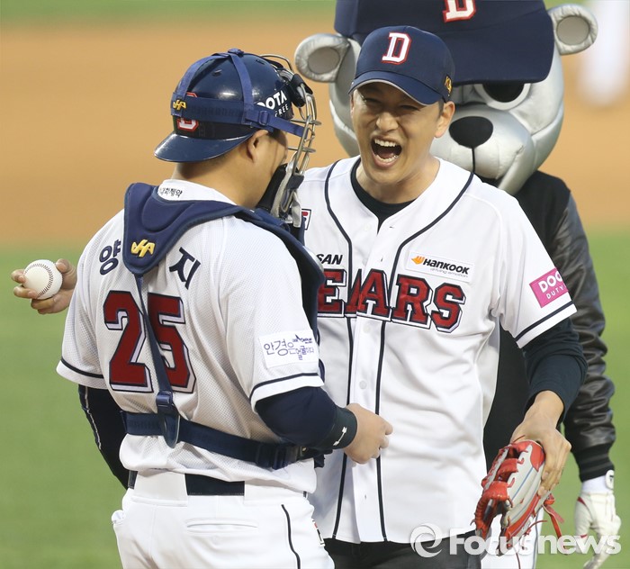 | △ 양의지와 껴안는 한석준 |