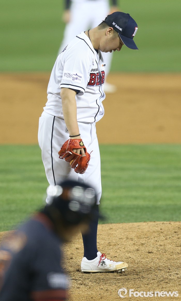 (서울=포커스뉴스) 22일 서울 잠실구장에서 열린 2016 프로야구 한화-두산 경기 3회초 두산 투수 유희관이 한화 이용규에게 볼넷을 내주고 아쉬워하고 있다.