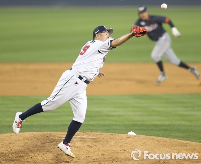 (서울=포커스뉴스) 22일 서울 잠실구장에서 열린 2016 프로야구 한화-두산 경기 2회초 2사 만루에서 두산 투수 유희관이 한화 차일목의 타구를 잡으려고 몸을 날리고 있다.