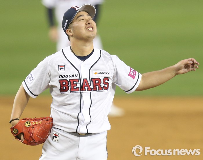 (서울=포커스뉴스) 22일 서울 잠실구장에서 열린 2016 프로야구 한화-두산 경기 3회초 두산 투수 유희관이 한화 이용규에게 볼넷을 내주고 아쉬워하고 있다.