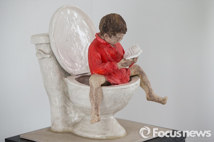 (서울=포커스뉴스) 세계 책의 날을 하루 앞둔 22일 오후 서울 광화문 북측광장에서 열린 '공공미술과 함께하는 월드북 데이' 행사에서 변기에서 독서하는 모습의 예술품이 설치되어 있다.