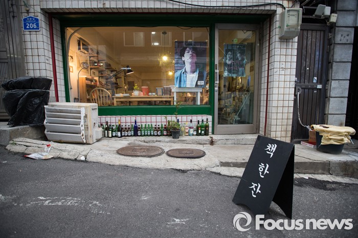 (서울=포커스뉴스) 세계 책의 날을 하루 앞둔 22일 오후 서울 마포구 이대역 인근의 독립 책방 '퇴근길 책한잔'. 이 책방은 책과 함께 술을 마실 수 있는 이색적인 장소로 유명하다.