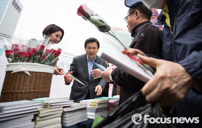 (서울=포커스뉴스)유네스코가 1995년 제정한 ‘세계 책과 저작권의 날’인 23일 오전 서울 중구 청계광장에서 열린 2016 세계 책의 날 기념 책드림 행사 '두근두근 책 속으로'에서 황교안 국무총리가 시민들에게 책과 꽃을 선물하고 있다.
