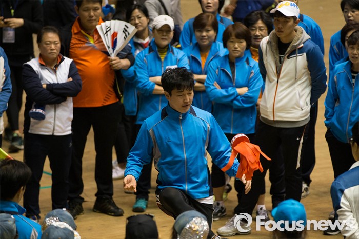 (서울=포커스뉴스) 24일 오전 서울 송파구 잠실실내체육관에서 열린 '2016 서울시민 생활체육대회' 참가자가 제기차기를 하고 있다.