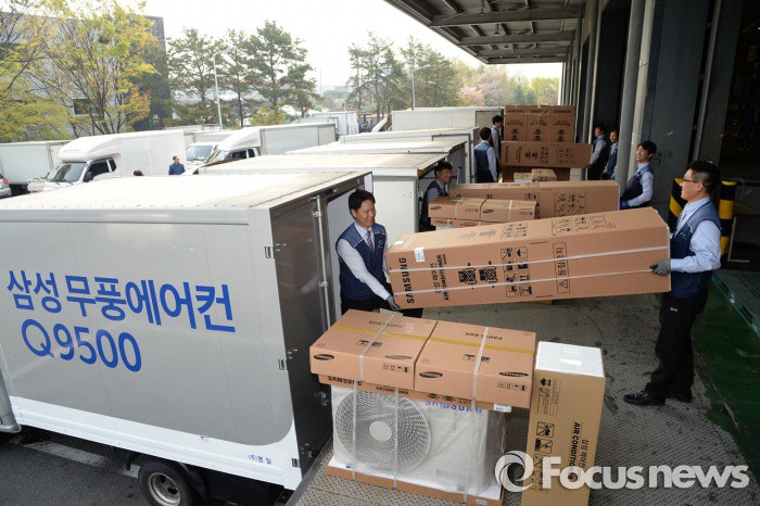 (서울=포커스뉴스) 삼성전자 에어컨 전문 설치기사들이 경기 고양시 덕이동 삼성전자 서서울물류센터에서 삼성 무풍에어컨 'Q9500'을 배송 차량에 싣고 있다. <사진제공= 삼성전자>