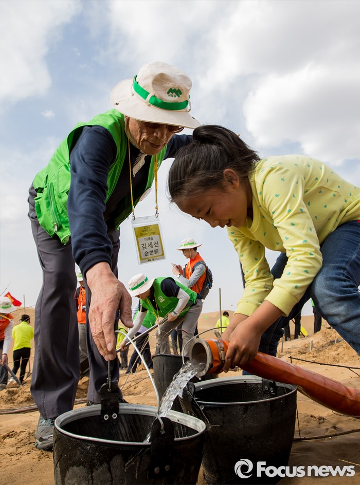 (다라더치/중국=포커스뉴스) 24일 오후 중국 내몽고 다라더치 쿠부치사막에서 2016 미래숲 15기 녹색봉사단 후원사 회원들이 나무심기작업을 하고 있다. 미래숲 녹색봉사단은 이번 봉사활동을 통해 황폐화된 사막에 나무 심기 및 각국 청년들과 우호를 증진을 위한 교류 활동을 전개할 예정이다.