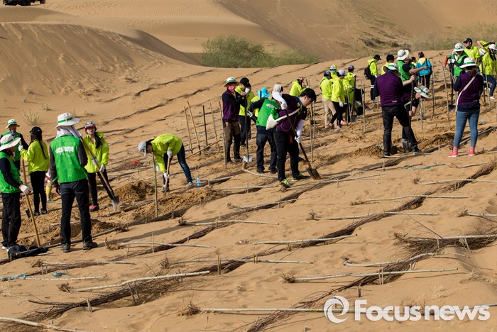 (다라더치/중국=포커스뉴스) 24일 오후 중국 내몽고 다라더치 쿠부치사막에서 2016 미래숲 15기 녹색봉사단 후원사 회원들이 나무심기작업을 하고 있다. 미래숲 녹색봉사단은 이번 봉사활동을 통해 황폐화된 사막에 나무 심기 및 각국 청년들과 우호를 증진을 위한 교류 활동을 전개할 예정이다.