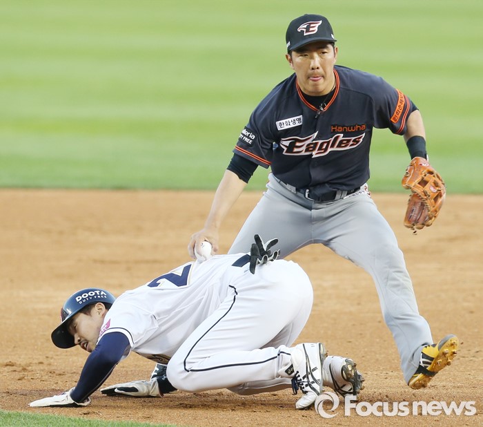 (서울=포커스뉴스) 24일 서울 잠실구장에서 열린 2016 프로야구 한화-두산 경기 5회말 1사 만루에서 한화 2루수 정근우가 두산 건우의 타구를 잡아 1루주자 오재원을 태그아웃 시키고 있다.