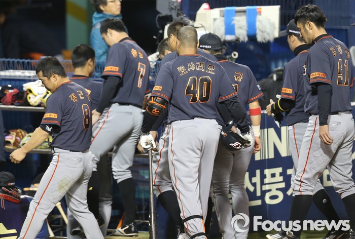 (서울=포커스뉴스) 24일 서울 잠실구장에서 열린 2016 프로야구 한화-두산 경기에서 두산에 3연패한 한화 선수들이 경기를 마치고 씁쓸한 발걸음을 하고 있다.