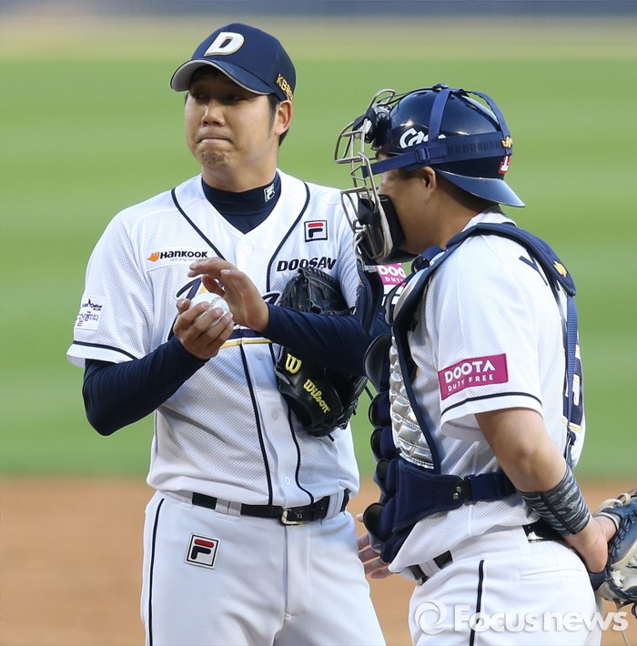 (서울=포커스뉴스) 24일 서울 잠실구장에서 열린 2016 프로야구 한화-두산 경기 5회 2사 1,3루에서 두산 포수 양의지가 마운드에 올라가 투수 장원준과 대화하고 있다.