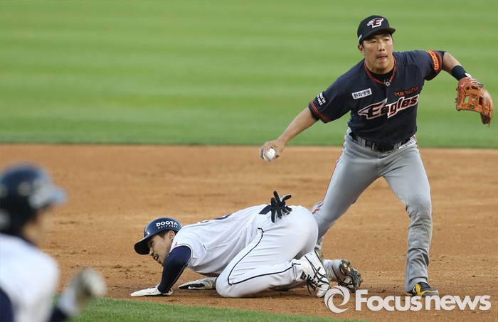 (서울=포커스뉴스) 24일 서울 잠실구장에서 열린 2016 프로야구 한화-두산 경기 5회말 1사 만루에서 한화 2루수 정근우가 두산 건우의 타구를 잡아 1루주자 오재원을 태그아웃 시킨후 1루로 송구해 타자 주자도 잡아 병살을 성공시키고 있다.