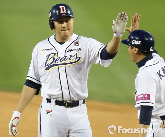 (서울=포커스뉴스) 24일 서울 잠실구장에서 열린 2016 프로야구 한화-두산 경기 6회말 2사 만루에서 두산 오재일이 좌중간 2타점 안타를 치고 1루에서 강동우 코치와 하이파이브하고 있다.