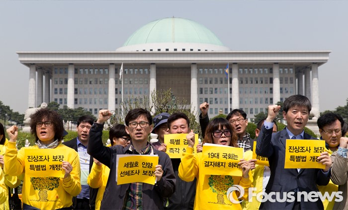 (서울=포커스뉴스) 세월호 참사 유가족들이 국회에 세월호 특별조사위원회의 조사활동 보장과 특검 실시를 촉구했다.