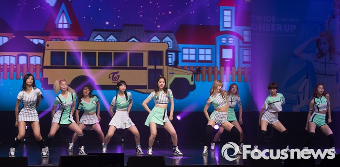 (서울=포커스뉴스) 25일 오후 서울 광진구 예스24 라이브홀에서 열린 걸그룹 트와이스의 미니앨범 'PAGE TWO' 발표 쇼케이스에 참석한 멤버들이 신곡무대를 선보이고 있다.