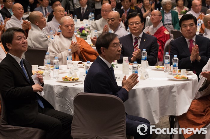 (서울=포커스뉴스) 2일 오후 서울 중구 프레스센터에서 열린 BBS 불교방송 개국 26주년 기념 비전선포식에서 안철수(왼쪽부터 반시계방향) 국민의당 상임공동대표, 박원순 서울시장, 원유철 새누리당 원내대표, 정의화 국회의장이 자리에 앉아 합장을 하고 있다.