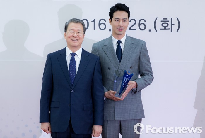 (서울=포커스뉴스) 26일 오후 서울 종로구 서울지방국세청에서 2016 국세청 홍보대사로 위촉된 배우 조인성(오른쪽)이 임환수 국세청장과 기념촬영을 하고 있다.