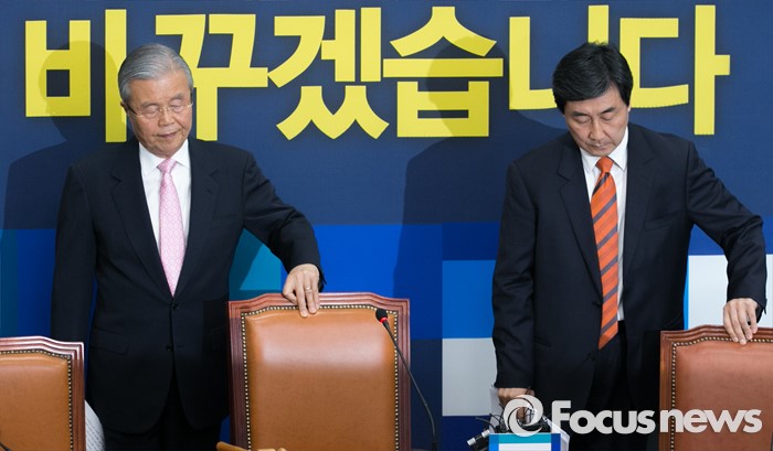 (서울=포커스뉴스) 김종인(왼쪽) 더불어민주당 비대위 대표와 이종걸 원내대표가 27일 오전 서울 여의도 국회에서 열린 비상대책위원회의에 참석하고 있다.