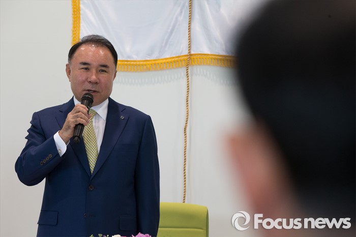 (서울=포커스뉴스) 25일 오전 서울 관악구 서울대학교 수의과대학 생명공학 연구동에서 열린 서울대-BBQ 공동연구 조인식에 윤홍근 제너시스비비큐 그룹 회장이 축하인사를 하고 있다.