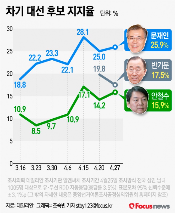 (서울=포커스뉴스) 데일리안과 알앤써치의 4월 4주차 차기대선후보 지지율 정례조사 결과 문재인 더불어민주당 전 대표가 25.9%의 지지율로 반기문 유엔 사무총장을 제치고 1위를 기록했다고 27일 밝혔다.