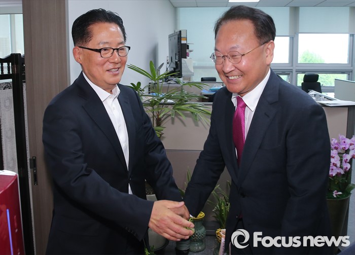 (서울=포커스뉴스) 박지원(왼쪽) 국민의당 원내대표가 29일 오전 서울 여의도 국회 의원회관에서 경제활성화법안 등 처리 요청을 위해 방문한 유일호 경제부총리 겸 기획재정부 장관과 면담에 앞서 인사하고 있다.