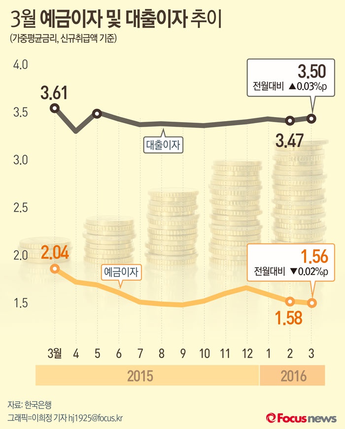 28일 한국은행이 낸 '2016년 3월중 금융기관 가중평균금리' 자료를 보면 지난달 시중은행이 가계에 빌려준 돈에 붙인 이자는 연 3.24%(이하 신규취급액 기준)로 지난달보다 0.03%포인트 올랐다. 반면 시중은행의 정기예금 금리는 1.54%로 전월(1.56%)보다 0.02%포인트 떨어졌다. 예대금리차는 지난달 1.70%포인트로 전월 1.65%보다 0.05% 확대됐다.