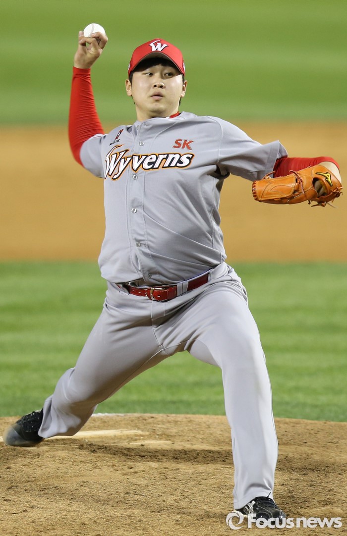 (서울=포커스뉴스) 27일 서울 잠실구장에서 열린 2016 프로야구 SK-두산 경기에서 SK 투수 박민호가 7회 2사후 마운드에 올라 투구하고 있다.