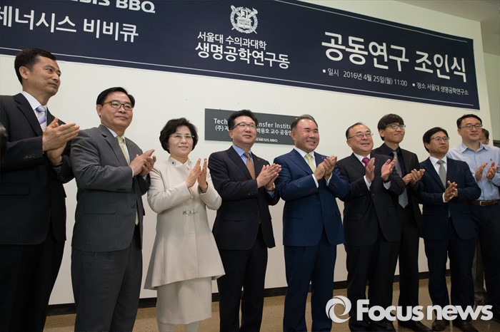 (서울=포커스뉴스) 25일 오전 서울 관악구 서울대학교 수의과대학 생명공학 연구동에서 열린 서울대-BBQ 공동연구 조인식에서 윤홍근(왼쪽 다섯째) 제너시스비비큐 그룹 회장과 박용호 서울대 수의과대학 교수가 현판식을 끝내고 박수를 치고 있다.