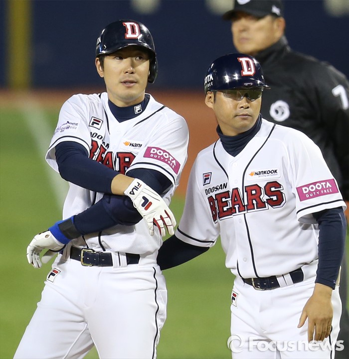 (서울=포커스뉴스) 27일 서울 잠실구장에서 열린 2016 프로야구 SK-두산 경기 9회말 1사 1,3루에서 두산 김재호가1타점 우전안타를 치고 1루에서 강동우 코치와 덕아웃을 바라보고 있다.
