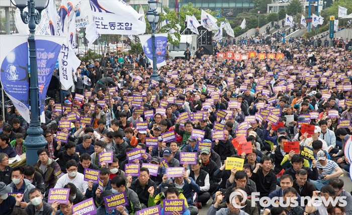 (서울=포커스뉴스) 30일 오후 서울역 광장에서 민주노총 공공운수 전국철도노동조합 회원들이 '철도노동자 1차 총력 결의대회'를 하고 있다.