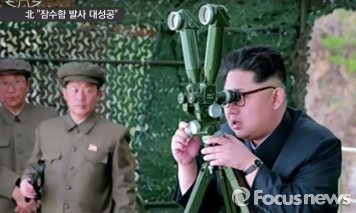 (서울=포커스뉴스) 북한이 24일 동해안 신포항 인근에서 SLBM(잠수함발사탄도미사일)발사에 성공했다고 북한 중앙조선TV를 통해 발표하고 있다. 김정은북한 최고지도자가 이 광경을 살펴보고 있다.