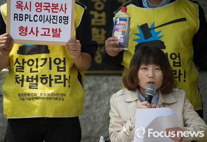 (서울=포커스뉴스) 2일 오후 서울 서초구 서울중앙지방검찰청 앞에서 가습기살균제 피해자 윤정애 씨가 옥시레킷벤키저 대표 등 8명의 이사진 형사고발 기자회견 중 모두발언 하고 있다.