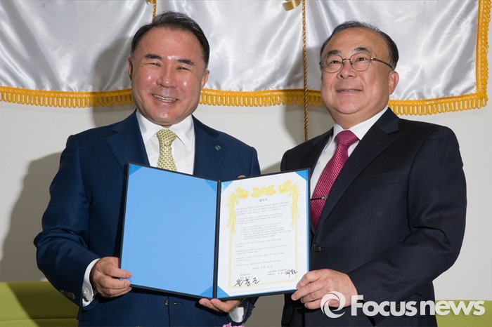 (서울=포커스뉴스) 25일 오전 서울 관악구 서울대학교 수의과대학 생명공학 연구동에서 열린 서울대-BBQ 공동연구 조인식에 윤홍근(왼쪽) 제너시스비비큐 그룹 회장과 박용호 서울대 수의과대학 교수가 협약서를 들고 기념촬영하고 있다.
