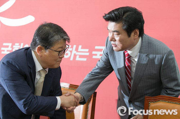 | △ 악수하는 원유철·조원진 |