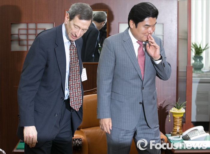 (서울=포커스뉴스) 원유철(오른쪽) 새누리당 원내대표가 27일 오후 서울 여의도 국회를 방문한 로버트 아인혼 전 미국 국무부 차관보와 면담에 앞서 인사한 뒤 자리로 향하고 있다.