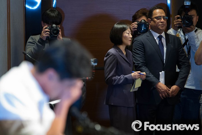 (서울=포커스뉴스) 2일 오전 서울 영등포구 콘래드호텔에서 열린 옥시레킷벤키저 기자회견에 참석한 가습기살균제피해자유가족연대 최승운 대표가 아타 샤프달 옥시 한국법인장의 입장표명을 거부하는 발언을 하고 있다.