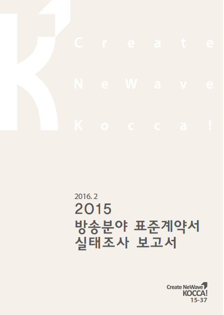 이번에 시행된 '방송 분야 표준계약서 실태조사'는 임의표본추출방식으로 외주제작사 102개 업체와 출연진(가수, 배우 등) 178명, 제작 스태프 58명, 독립연출자 104명을 조사했다. '2015 방송 분야 표준계약서 실태조사' 보고서는 콘진원 홈페이지에서 무료로 볼 수 있다.'2015 방송분야 표준계약서 실태조사' 보고서 표지.<사진제공=한국콘텐츠진흥원>