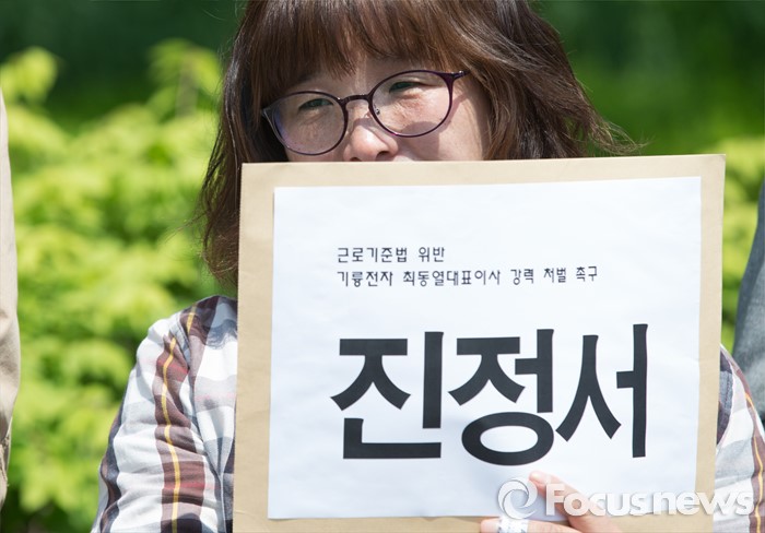 (서울=포커스뉴스) 29일 오전 서울 서초구 서울중앙지검 앞에서 열린 '불법 기업주 강력 처벌 촉구, 유흥희 분회장 항의 노역' 기자회견에 참석한 유흥희 기륭전자 노조분회장이 진정서를 들고 있다.