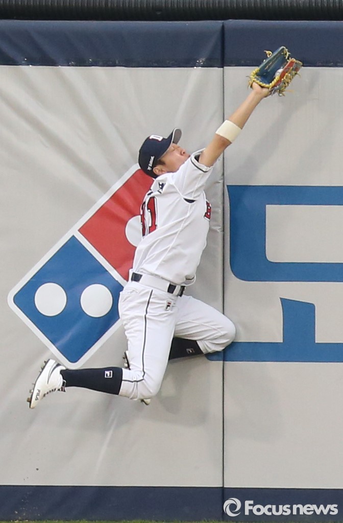(서울=포커스뉴스) 26일 서울 잠실구장에서 열린 2016 프로야구 SK-두산 경기 1회초 1사 1루에서 두산 중견수 정수빈이 SK 최정의 타구를 펜스에 부딪치며 잡고 있다.
