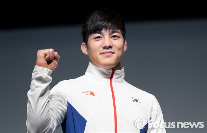 (서울=포커스뉴스) 27일 오후 서울 노원구 태릉선수촌에서 열린 제31회 리우하계올림픽대회 D-100일 미디어데이에서 레슬링 국가대표 김현우가 리우올림픽 선수단 단복을 선보이고 있다.